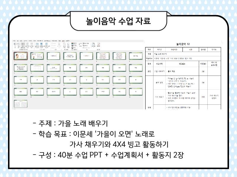 구성은 40분 수업 PPT + 수업계획서 + 활동지 2장 + 가을이 오면 악보입니다.