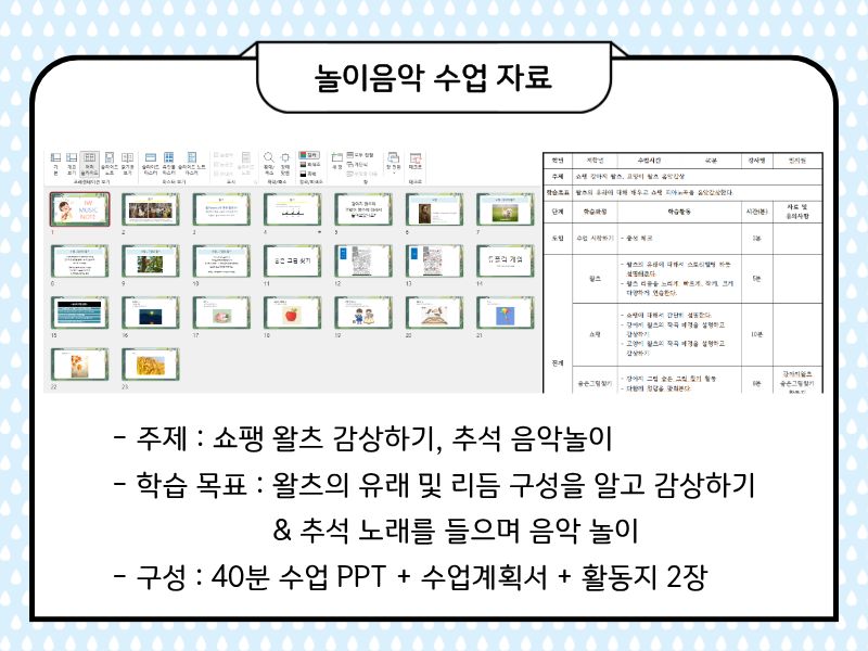 구성은 40분 수업을 위한 PPT, 그리고 자세하게 적어놓은 수업계획서입니다.