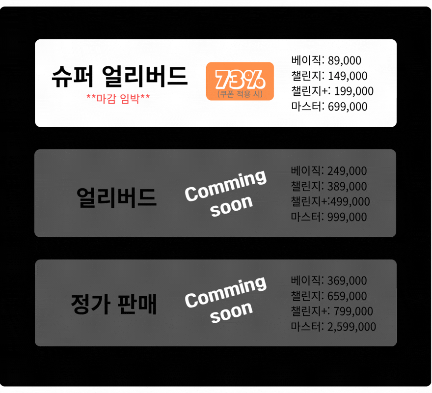 2,599,000원73%699,000원아래 내용은 기본 환불 규정이며, 실제 환불 가능 여부 및 세부 조건은 각 상품별 크리에이터의 규정에 따라 달라질 수 있습니다.