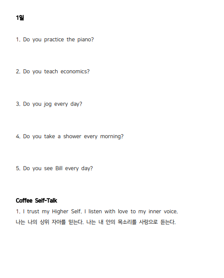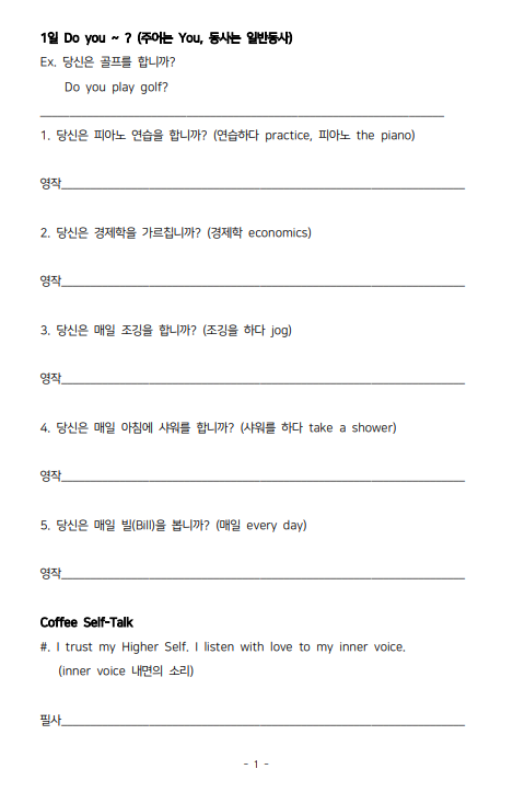 30일간 긍정 ‘Self-Talk’와 1일 문장 5개를 영작하는 연습을 하다보면 영작과 회화에 숙달하게 되리라고 봅니다.